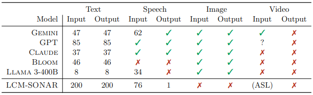 SONAR라는 문장 임베딩 공간을 활용하여 200개 언어의 텍스트와 76개 언어의 음성을 지원