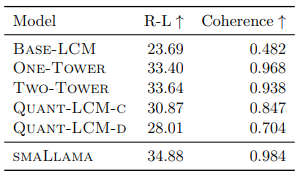 Diffusion LCM이 Quant-LCM보다 높은 ROUGE-L 및 Coherence 점수 기록