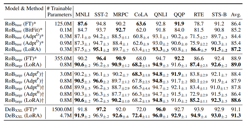 - RoBERTabase, RoBERTalarge, DeBERTaXXL에 대한 GLUE 밴치마크