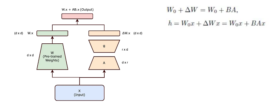 - 기존 모델의 가중치 매트릭스가 dk 크기를 가질 때, 이를 dr 매트릭스 B와 r*k 매트릭스 A로 나타낼 수 있음 =>r은 d,k보다 작은 차원