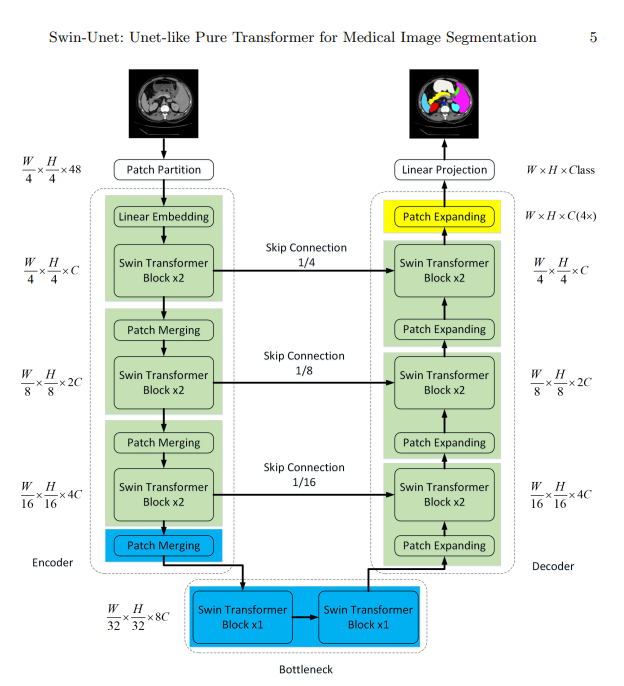 Swin-Unet은 Encoder, Bottleneck, Decoder, Skip Connections로 구성되어 있고 기본 단위는 swin transformer block이다.