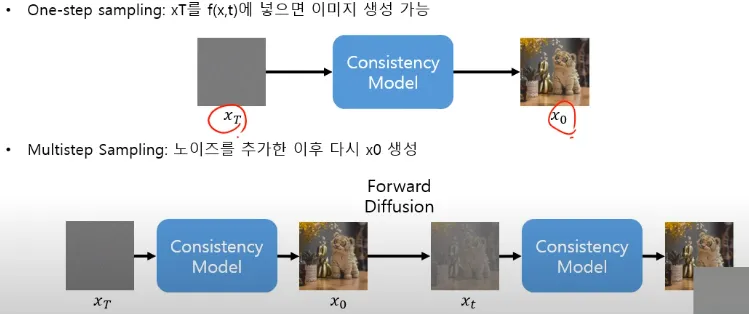 - → Loss는 같음: $f_\theta$가 연속적인 두 샘플링 단계에서 일관된 출력(consistency)을 유지하도록 학습함.