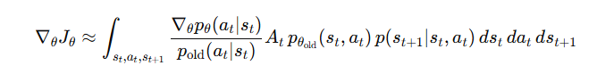 이 식에서 원래 예전 알고리즘에 경우에는 old policy에 대해서 재활용을 하지 않고 trajectory를 rollout하고 업데이트 시키고 다른 trajectory를 roll out하고 업데이트하는 식으로 학습을 진행했지만 PPO에서는 old policy를 사용해서 sample efficiency를 높이고자 하였다. old policy를 이용하게 된다면 위의 정책 그레디언트 식은 다음과 같이 변형될 수 있다.