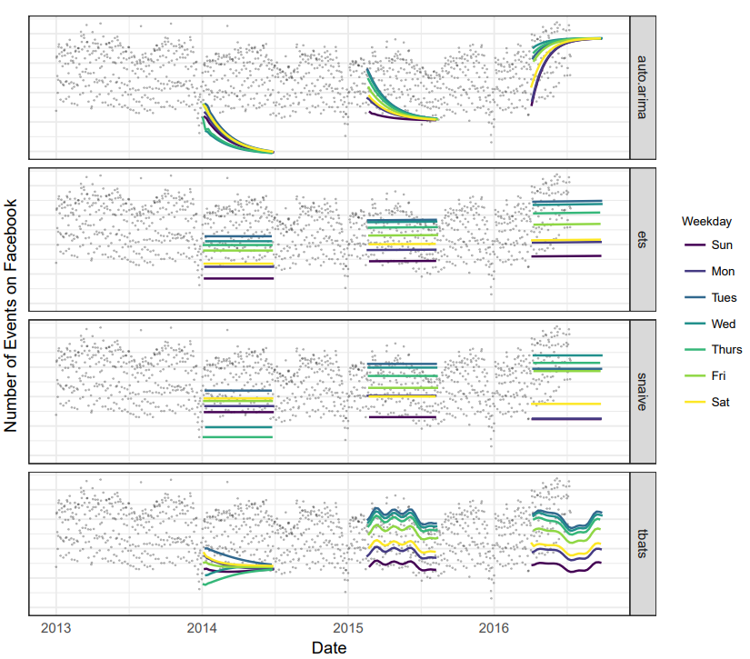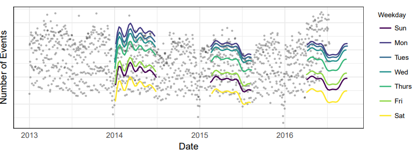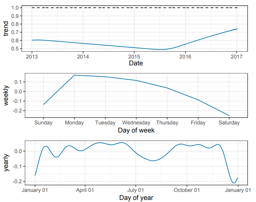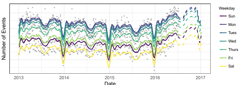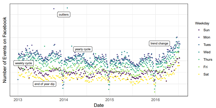 ● 위의 그림에서는 페이스북에서의 이벤트 생성 수를 시각화, 몇가지 뚜렷한 계절적 효과를 확인할 수 있음. 주간, 연간 차이, 크리스마스나, 새해 주변에서의 하락성이 나타나고, (2017년 기준) 최근 6개월은 이전과는 다른 변화가 관찰됨.
