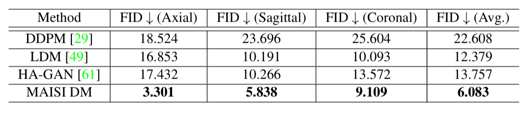 - DDPM, LDM, HA-GAN과 비교하였을 때 실제 dataset과 유사한 이미지를 생성.