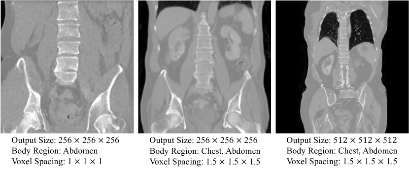- flexible dimension의 압축된 latent space에서 작동, body region 및 voxel spacing을 conditional input으로 통합