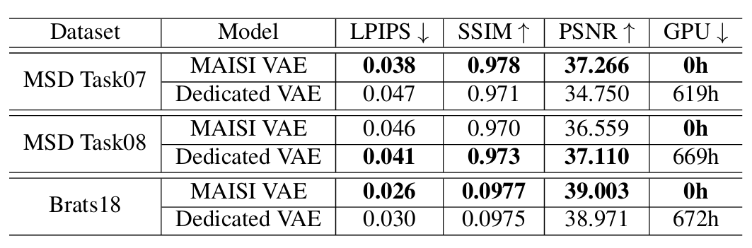 - out-of distribution dataset에 대해 MAISI VAE model과 dedicated VAE(test dataset 내에서 학습) 성능 비교