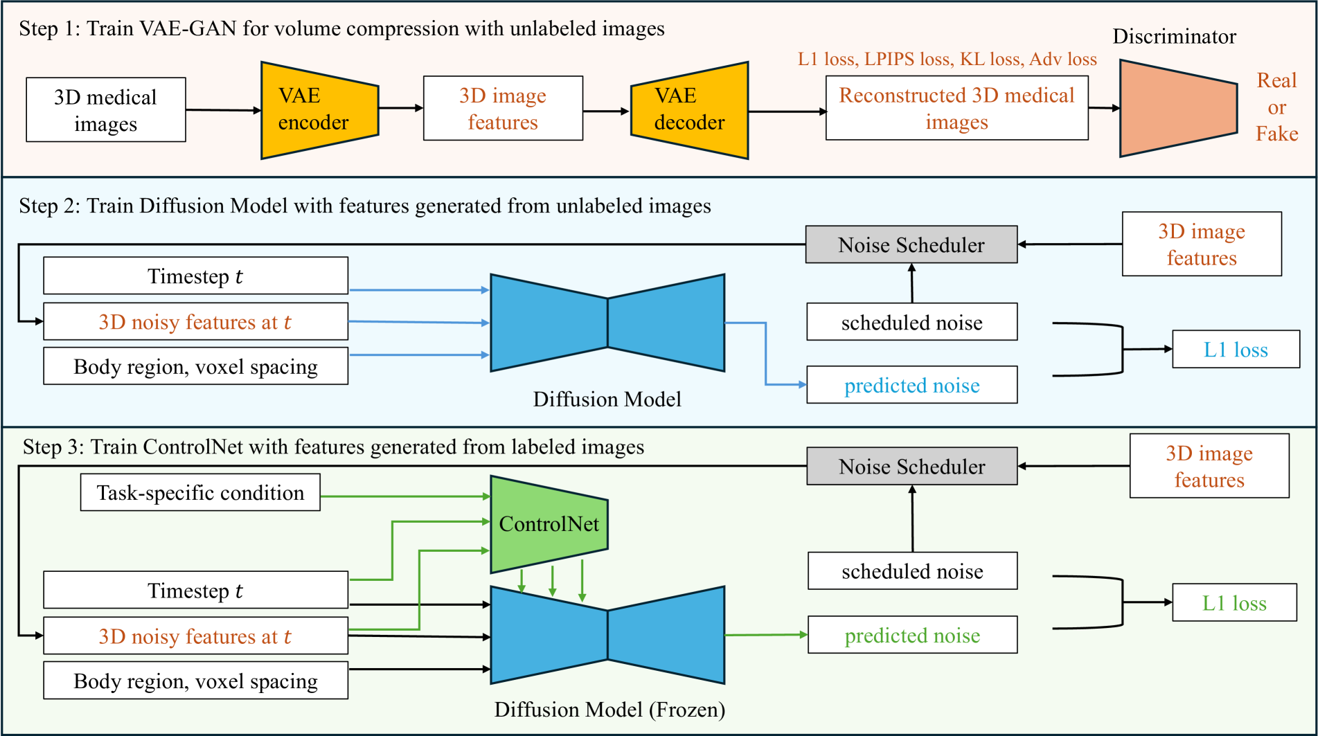 → 고해상도 3D CT volume generation을 위해 Volume Compression Network, Latent Diffusion model, ControlNet으로 구성된 3D network 제안