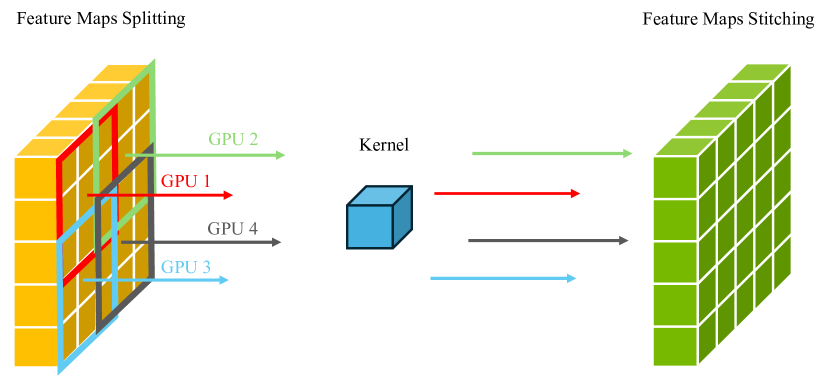- Convolution, normalization layer에서 필요한 overlap을 보존하면서 feature map을 더 작은 segment로 분할, 지정된 device에 할당 후 병합되어 layer output 생성