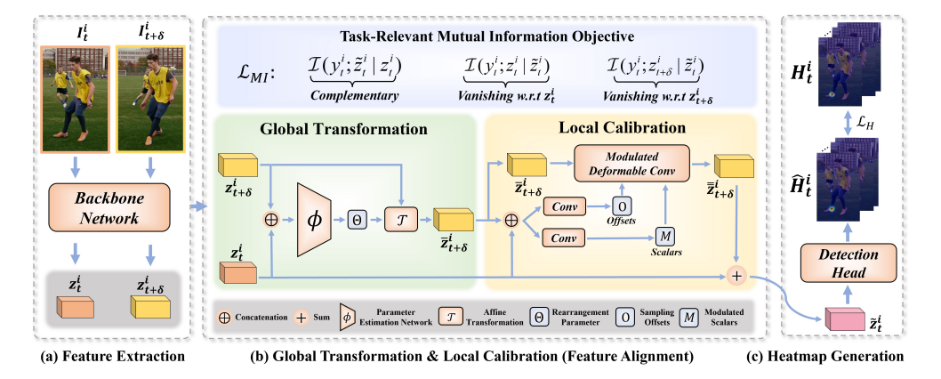 주어진 비디오에서 특정 순간의 키 프레임 $I_t^i$ (왼쪽 이미지)과, 그와 가까운 시간대의 지원 프레임 $I_{t+\delta}^i$ (오른쪽 이미지)를 입력으로 사용하고 Backbone Network을 통해 두 프레임의 특징을 추출하게 됩니다. $(z_t^i, z_{t+\delta}^i)$ - Global Transformation + Local Calibration (Feature Alignment)