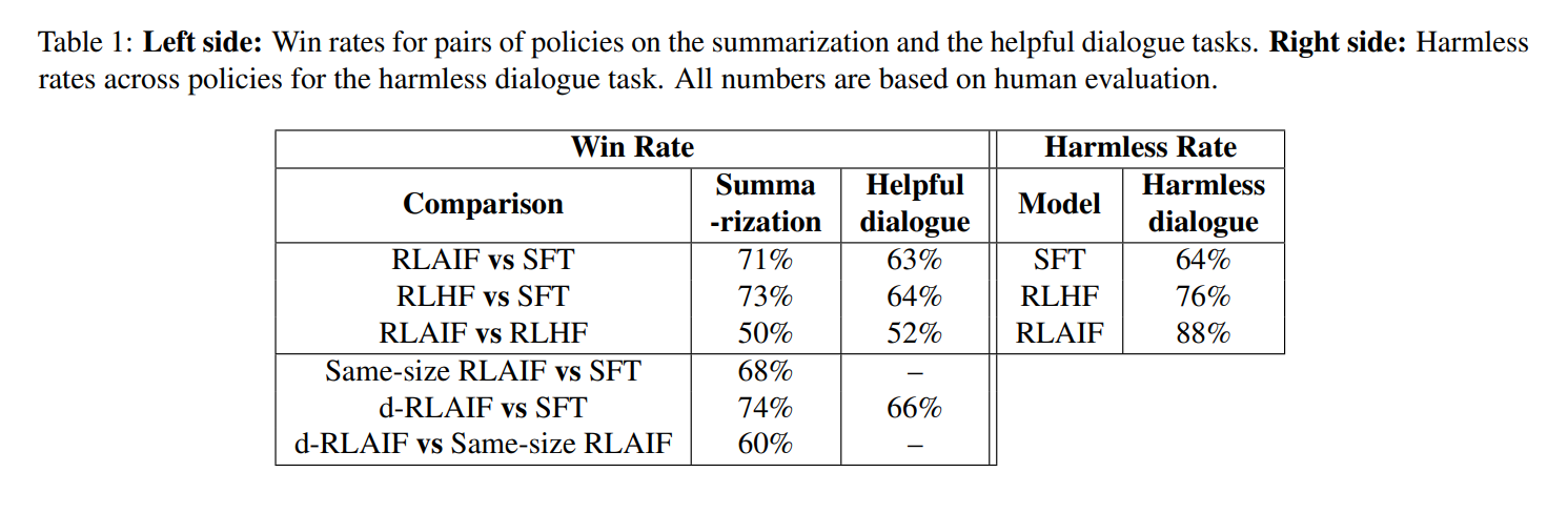 - summarization, helpful dialogue에서 RLHF와 RLAIF의 유의미한 차이가 존재하지 않음