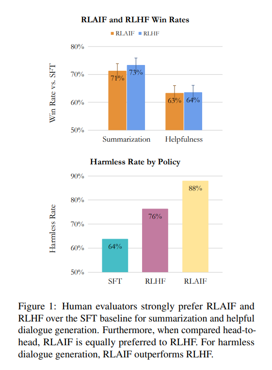 - RLAIF는 RLHF와 비교하여 유사한 성능 개선을 보였으며, 두 모델은 인간 평가자들에게 비슷한 비율로 선호된다.