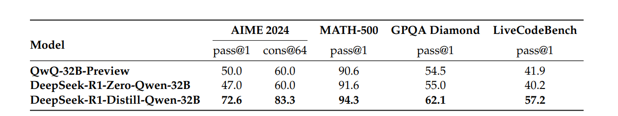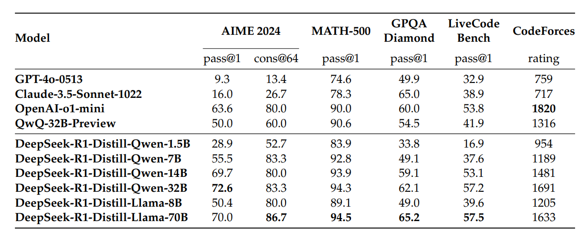 Qwen 모델과 Llama 모델에 §2.3.3에서 정리한 800k개의 추론 데이터를 사용해 미세 조정을 진행하였더니 RL방법을 쓰지 않아도 추론 능력이 비약적으로 상승함.