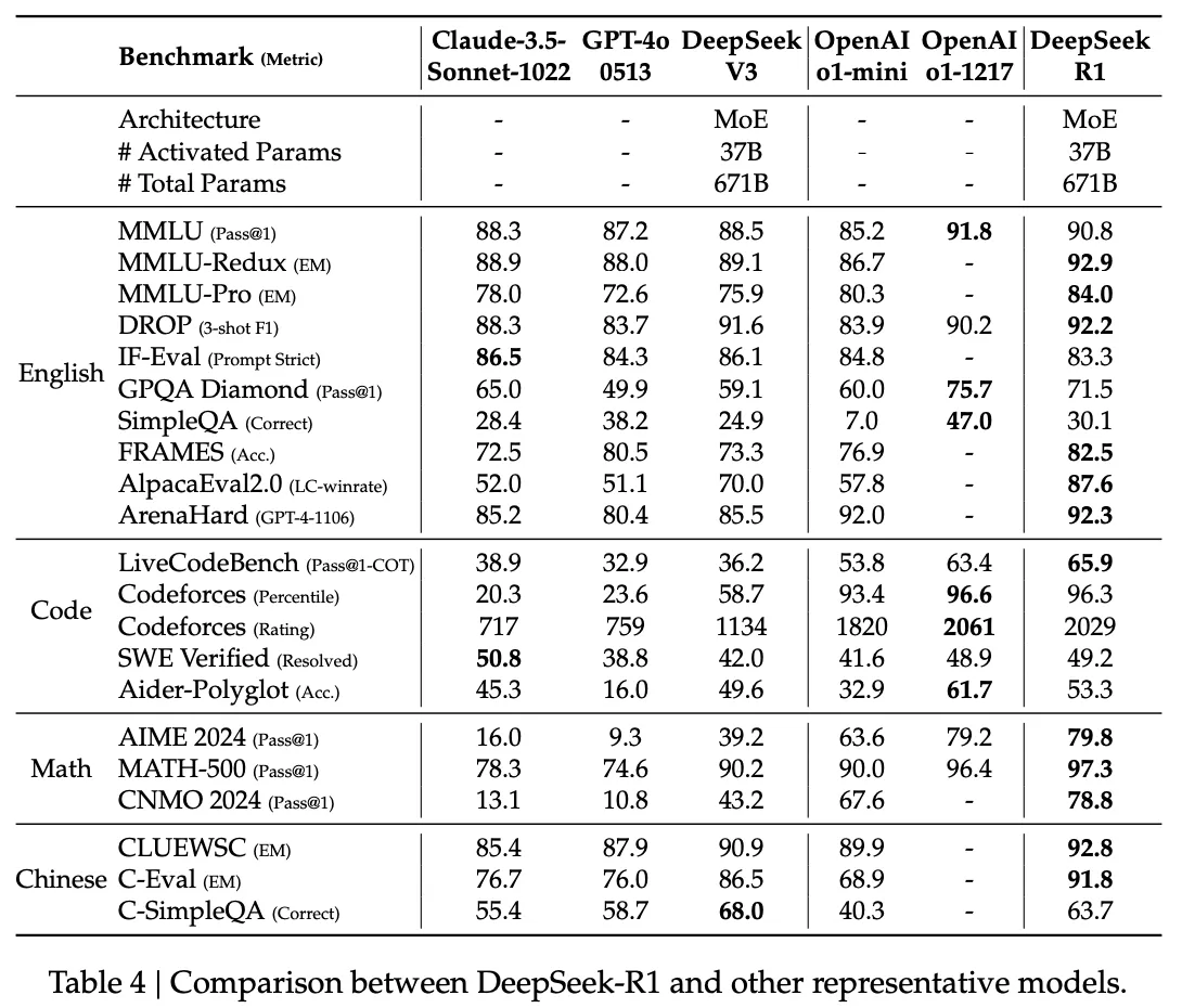 - DeepSeek-R1은 초기 데이터를 활용하고 반복적인 RL FT를 통해 더 강력한 성능을 발휘하며, 여러 작업에서 OpenAI-o1-1217과 비슷한 성능을 기록했다.