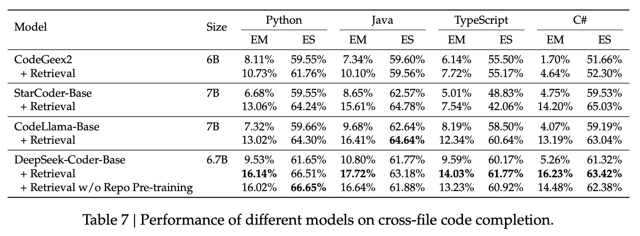 여러 모델 평가에서 최대 시퀸스 길이는 2048 토큰, 최대 출력 길이는 50 토큰, 다중 파일 문맥 제한은 512 토큰으로 설정하고, 다중 파일 문맥은 BM25 검색 결과를 활용했다. 평가 지표로는 Exact Match(EM)과 Edit Similarity(ES)를 사용했다. Cross-file code completion에 대한 평가 결과는 Table 7에서 볼 수 있다. 이를 통해 Repo Pre-training이 모델의 성능에 영향을 미치는 것을 볼 수 있다.