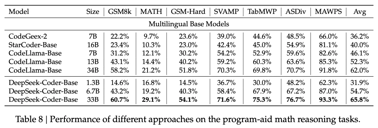 Program-based math reasoning에서의 평가를 위해 Program-Aided Math Reasoning(PAL) 방법을 활용한다. 이 방법을 고유한 7개의 벤치마크에 적용하고, 각 벤치마크에서 모델은 자연어로 해결 단계에 대한 설명을 번갈아 제공한 후 그 단계를 코드로 실행하는 방식으로 테스트된다. 평가 결과는 Table 8에서 볼 수 있다.