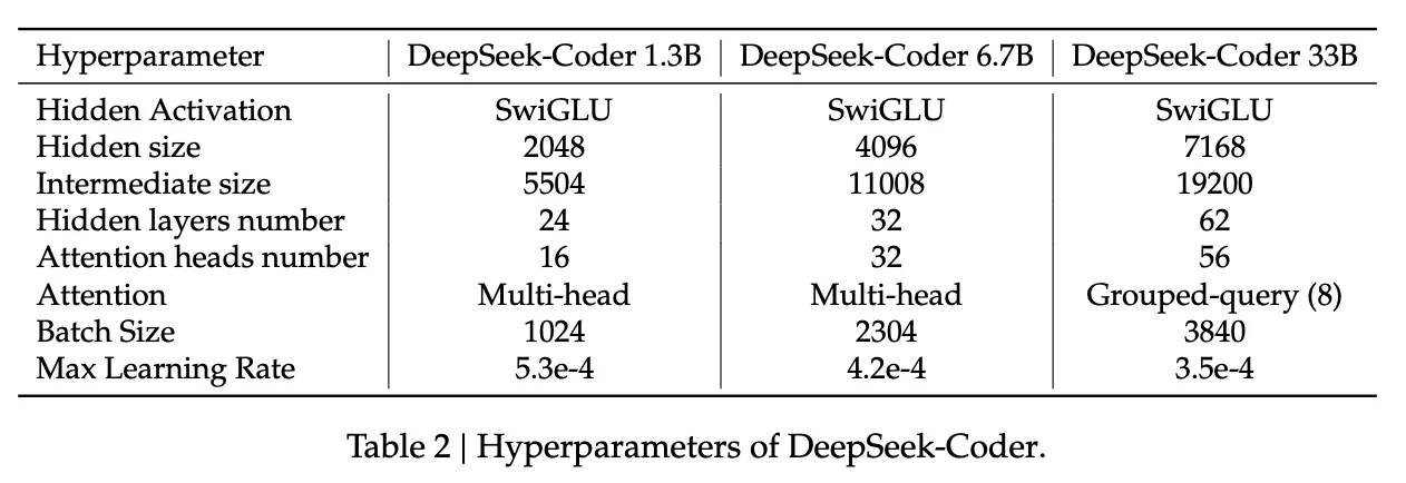 DeepSeek-Coder 시리즈의 각 모델은 디코더 전용 Transformer로, Rotary Position Embedding(RoPE)을 통합하여 구현한다. 특히, DeepSeek-Coder 33B 모델은 Grouped-Query-Attention(GQA)을 통합하여 그룹 크기를 8로 설정하여 훈련과 추론의 효율성을 향상시켰다. 또한, FlashAttention v2를 사용하여 어텐션 메커니즘에서의 계산 속도를 높였다. 모델의 아키텍처 세부 사항은 Table 2에 요약되어 있다.