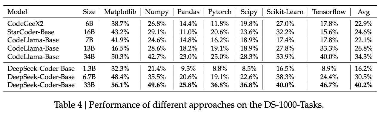 DS-1000 Benchmark는 Matplotlib, NumPy, Pandas, SciPy, Scikit Learn, PyTorch, TensorFlow 7개의 서로 다른 라이브러리에서 1,000개의 실제적이고 실용적인 DataScience Workflow를 포함한 포괄적인 데이터 셋을 제공한다. 이 Benchmark는 특정 테스트 케이스에 대해 실행하여 코드 생성을 평가하고, 문제를 라이브러리에 따라 분류하고 있다는 특징이 있다. 추가적으로 코드 완성 설정에서 기본 모델의 성능을 평가하며, 각 라이브러리별 pass@1 결과와 전체 점수를 제공한다. 이 Benchmark의 결과는 Table 4에서 볼 수 있다.