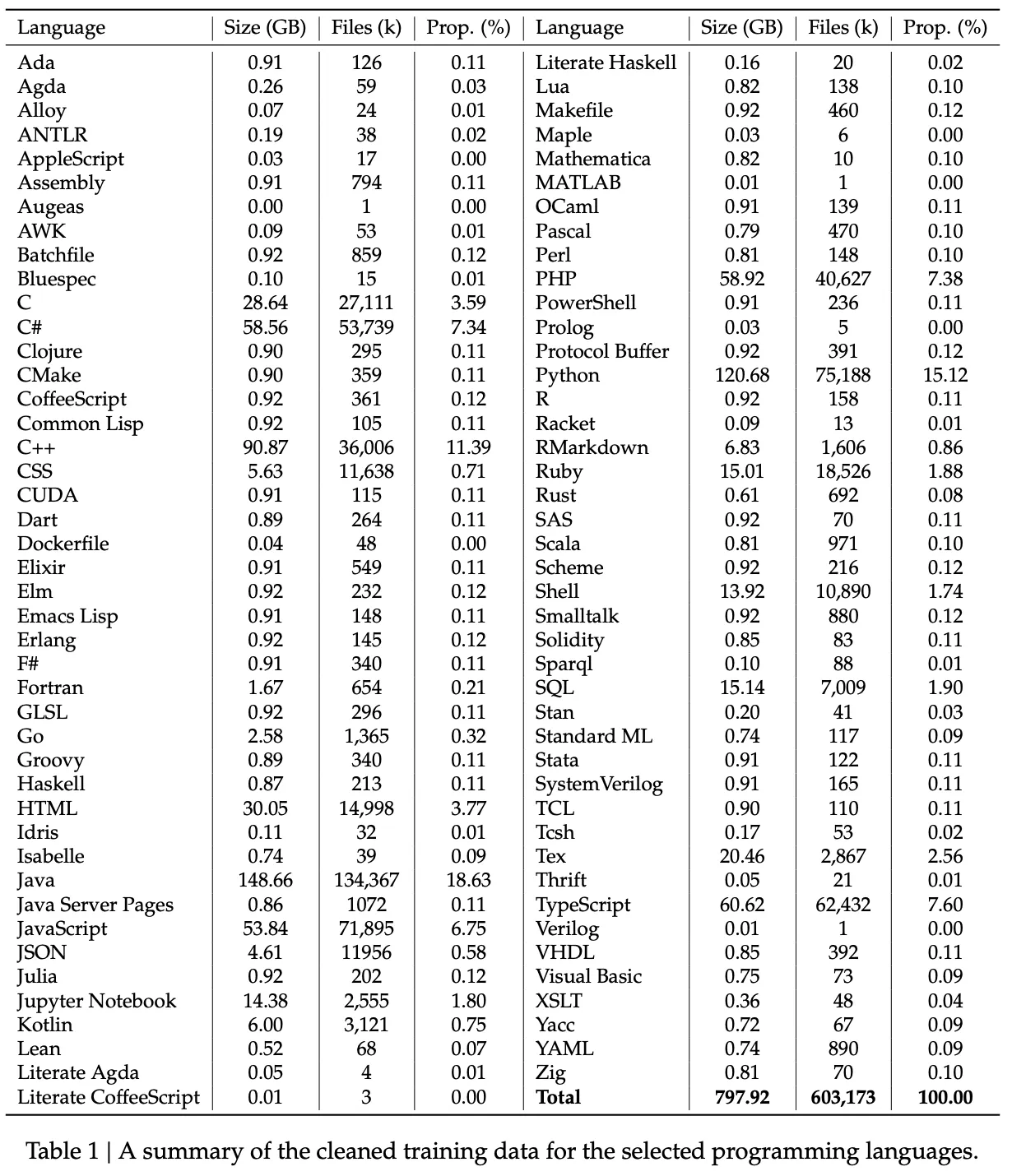 GitHub 데이터는 2023년 2월 이전에 생성된 공개 Repository에서 데이터를 수집하고, 87개의 프로그래밍 언어를 기준으로 데이터셋을 구성했다.(Table 1) 이후 데이터 처리량을 줄이기 위해 StarCoder 프로젝트에서 사용된 필터링 규칙과 유사한 방식을 적용하여 저품질 코드를 사전에 필터링했다. 이를 통해 전체 데이터의 크기가 원래의 32.8% 수준으로 감소했다.