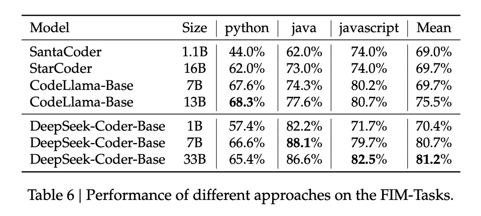 DeepSeek-Coder 모델은 사전 훈련 단계에서 0.5 FIM 비율로 훈련되어 prefix와 suffix의 정보를 바탕으로 공백을 채우는 방식으로 코드 생성 능력을 향상시켜준다. DeepSeek-Coder 모델 성능 평가에서는 코드 자동 완성 도구인 StantaCoder, StarCoder, CodeLlama 모델과의 비교 분석이 이루어졌다. 비교에 사용된 벤치마크는 Single-Line Infilling 벤치마크로, 세 가지 프로그래밍 언어(Python, Java, JavaScript)를 포함하며 Line exact match accuracy를 평가 지표로 사용한다. 이 벤치마크에 대한 결과는 Table 6에 나온다. 이 결과를 통해 코드 완성 작업에서 높은 정확도를 달성하기 위해서는 모델 용량이 중요하다는 것을 강조한다.