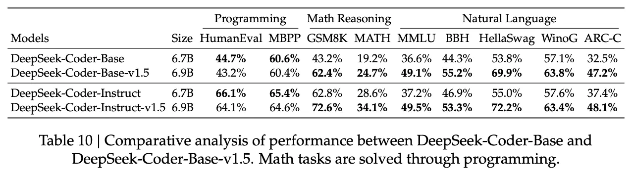 DeepSeek-Coder의 Base 및 Instruct 모델의 결과는 Table 10에서 볼 수 있다. 이 경우 DeepSeek-Coder-Base-v1.5 모델은 프로그래밍에서 낮은 성능을 보이지만 수학적 추론과 자연어 처리 부분에서는 뛰어난 성능을 보인다.
