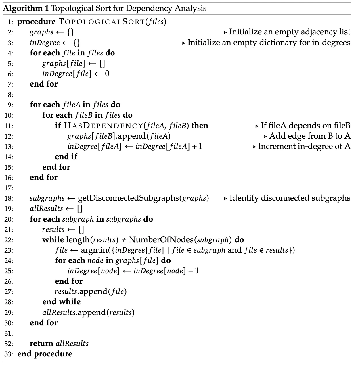 의존성 분석을 위한 Topological Sort 알고리즘은 다음과 같다.