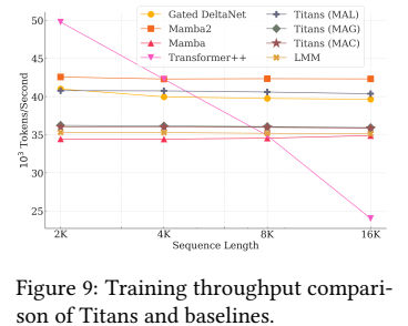 - Titans (MAL) 모델은 기준 모델들과 메모리 모듈보다 더 빠른 성능을 보였습니다. 이 성능 향상의 주요 이유는 Flash-Attention(Dao 2024)의 고도로 최적화된 커널 덕분