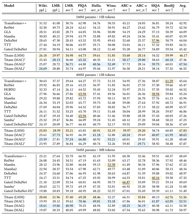 - 모델: Titans의 세 가지 변형(MAC, MAG, MAL)과 별도의 신경망 메모리 모듈을 사용. 이들은 170M, 340M, 400M, 760M 파라미터 규모로 실험을 진행