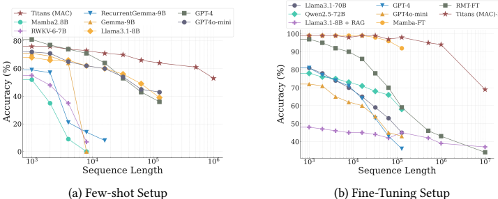 - Fine-tuning 설정: MAC 변형의 Titans를 미세 조정하여 다른 미세 조정된 모델들과 성능을 비교.