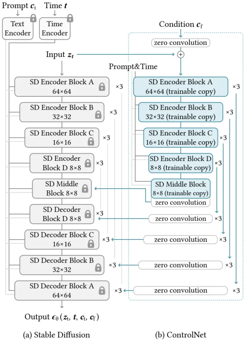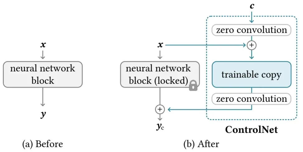 - ControlNet은 Diffusion Model의 신경망 블록을 고정(locked)한 상태에서 Trainable copy를 추가하여 학습 방식으로 동작함