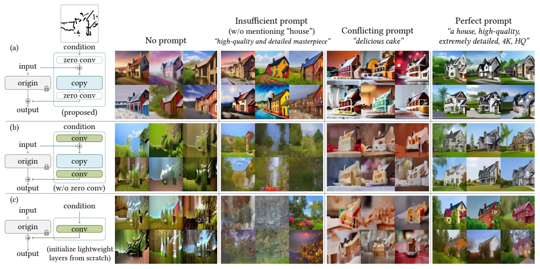 - zero convolution 적용과 prompt의 따른 이미지 생성 결과로 zero convolution을 적용했을 때 성능이 좋은 것을 확인할 수 있음