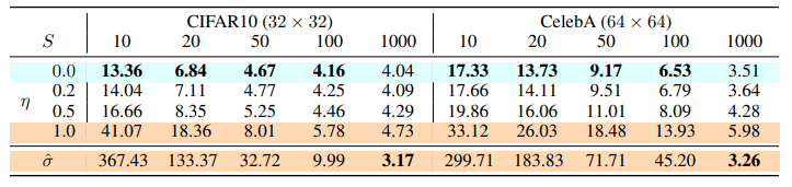아래 표는 $\tau$의 길이와 $\sigma$의 값에 따른 성능 측정 결과이다. $\hat{\sigma}$는 DDPM 논문 구현에서 CIFAR10 샘플들을 생성할 때 쓰이는 특별한 $\sigma$ 값이다.