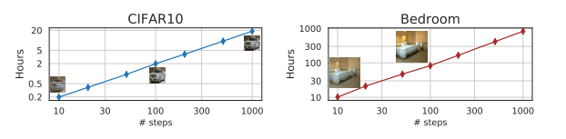 위 그래프에서 확인할 수 있듯이 $S$의 값, 즉 step의 수가 줄어듦에 따라 샘플링하는데 걸리는 시간도 이에 비례해서 줄어듦을 확인할 수 있다. DDIM을 사용하면 샘플링 성능의 큰 손해 없이 샘플링 시간을 크게 줄일 수 있다.