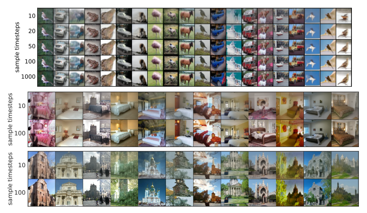 - DDIM은 DDPM보다 짧은 시간에 DDPM보다 좋은 품질의 이미지를 생성한다.