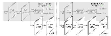 ResNet/ResNeXt(C4), FPN(Feature Pyramid Network)을 backbone으로 사용한 Faster R-CNN에 mask branch 달아서 mask 예측 수행