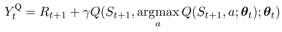 - Action을 선택하는 Q function(${\theta}_t$)과 평가하는 Q function($ {\theta}^{'}_t $)를 나누어 target 값을 정의.