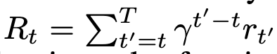 * 미래 보상이 타임스텝당 계수 γ 만큼 할인된다고 가정하며, 게임이 종료되는 타임스텝을 T라 할 때 시점 t 의 할인된 미래 보상(return)