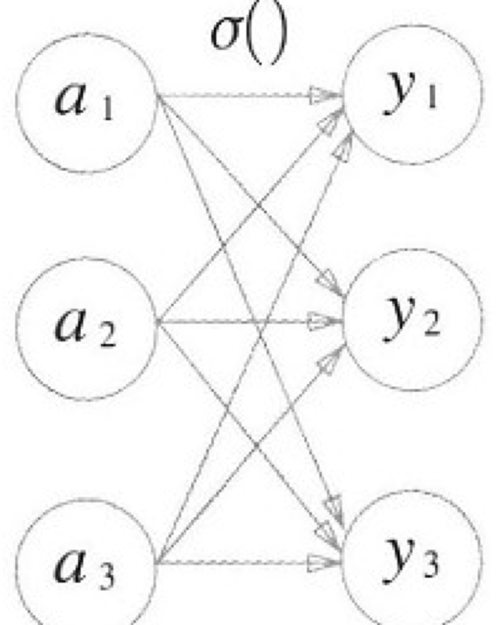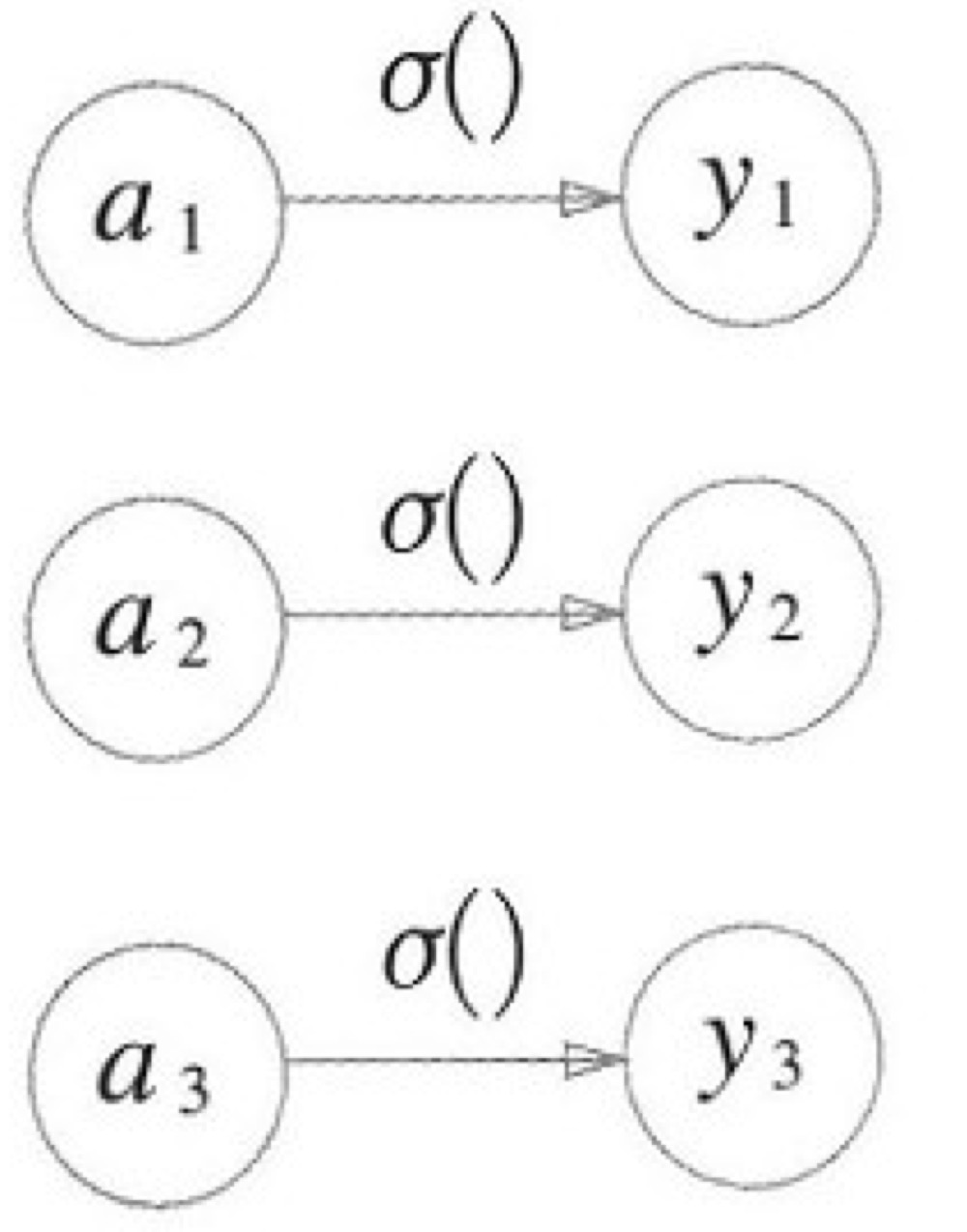 소프트맥스의 출력은 모든 입력 신호로부터 화살표를 받는데, 이는 식의 분모에서도 확인할 수 있다. 소프트맥스 함수는 다음과 같이 그림으로 표현될 수 있다: