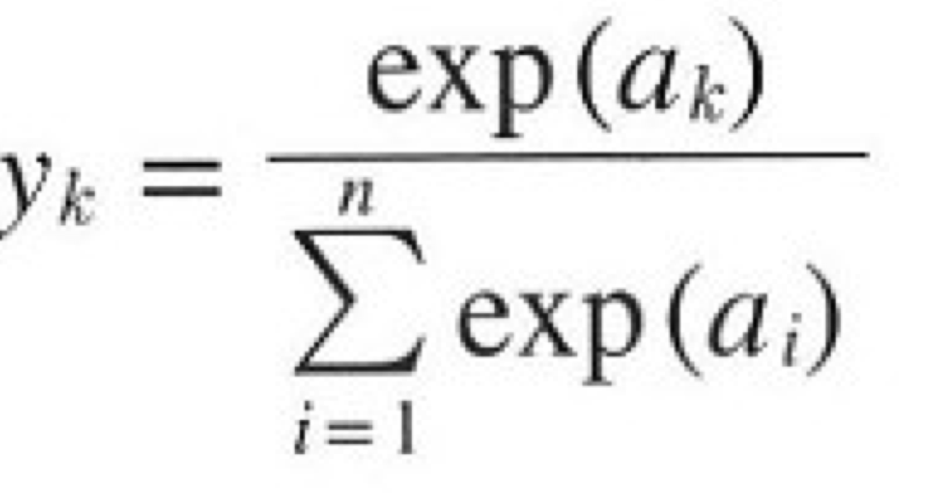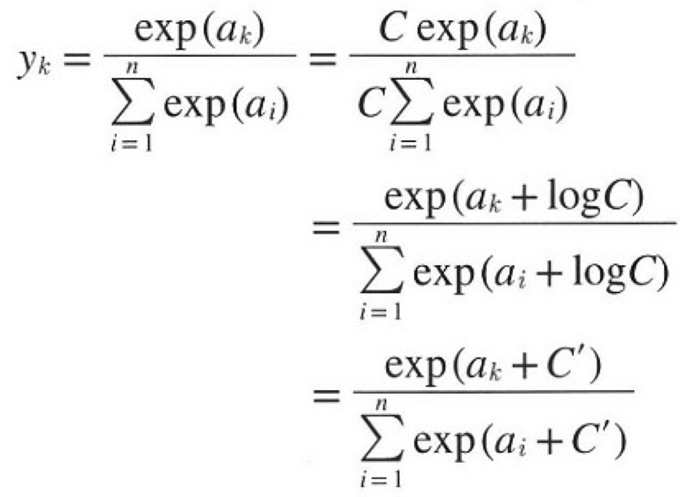 (이때 exp(x)는 e^x를, n은 출력층의 뉴런 수를, yk는 그중 k번째 출력임을 뜻한다.)