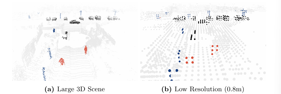 기존 3D perception 모델들은 낮은 해상도의 복셀화(voxelization)와 과도한 다운샘플링(downsampling) 때문에 작은 객체를 잘 인식하지 못한다는 한계가 있음.