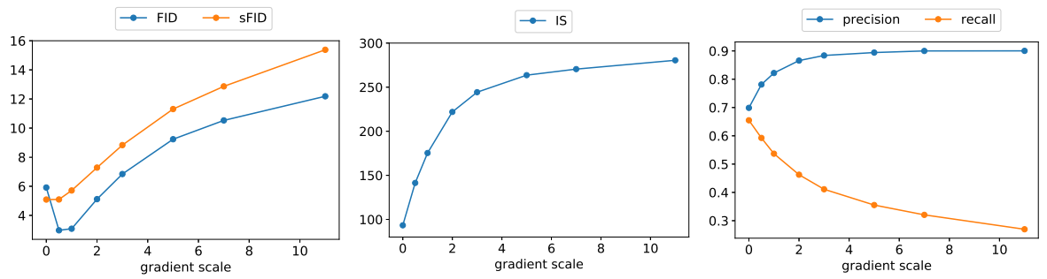 또한 classifier guidance가 recall을 희생시키면서 precision를 향상시켜 샘플의 fidelity와 diversity 사이의 trade-off를 도입함을 보여준다. 아래 그래프에서 gradient scale에 따라 이 trade-off가 어떻게 달라지는지 볼 수 있다.