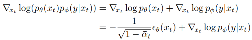 Diffusion model을 레이블 y로 컨디셔닝하면 다음과 같이 샘플링하는 것으로 충분하다.