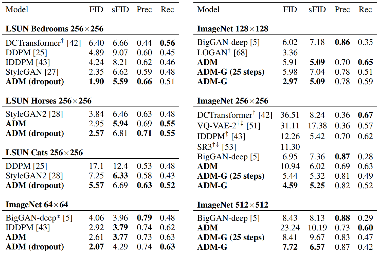위 표의 결과를 보면 본 논문이 제시한 모델이 모든 테스크에서 가장 낮은 FID를 기록한 것을 확인할 수 있다. sFID도 거의 모든 테스크에서 최고 성능을 보였다. Diffusion Model은 GAN과 비슷한 수준의 Perceptual Quality(시각적 품질)를 유지하면서도, 더 다양한 샘플을 생성할 수 있음을 알 수 있다.