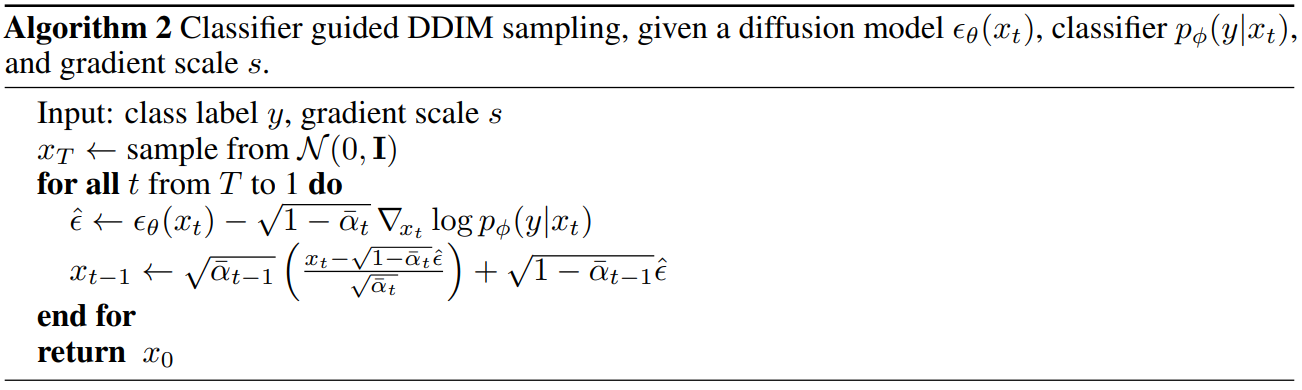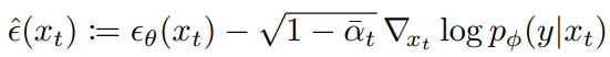 noise가 있는 이미지 x_t에 대해 classifier p_ϕ(y|x_t,t)를 훈련한 다음, gradient ∇x_tlogp_ϕ(y|x_t,t)를 사용하여 임의의 class y로 샘플링 프로세스를 guide 할 수 있다. 간결화를 위해 p_ϕ(y|x_t,t)=p_ϕ(y|x_t), ϵ_θ(x_t,t)=ϵ_θ(x_t)로 사용한다.
