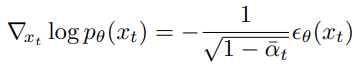 조건부 샘플링에 대한 위의 유도는 stochastic한 샘플링에만 유효하며 DDIM과 같은 deterministic한 샘플링 방법에는 적용할 수 없다. 이를 위해 diffusion model과 score matching 사이의 연결을 활용하는 score 기반 컨디셔닝 트릭을 사용한다. 특히 샘플에 추가된 noise를 예측하는 모델 ϵ_θ(x_t)가 있는 경우 다음과 같이 score function을 도출하는 데 사용할 수 있다.