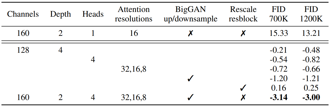 저자들은 attention 구성에 대해서도 연구했다. 이를 위해 attention head를 상수로 고정하거나 head당 채널 수를 고정하는 실험을 했다. 나머지 아키텍처에서는 128개의 기본 채널, resolution당 2개의 residual block, multi-resolution attention, BigGAN up/downsampling을 사용하고 70만 iteration에 대해 모델을 학습한다.