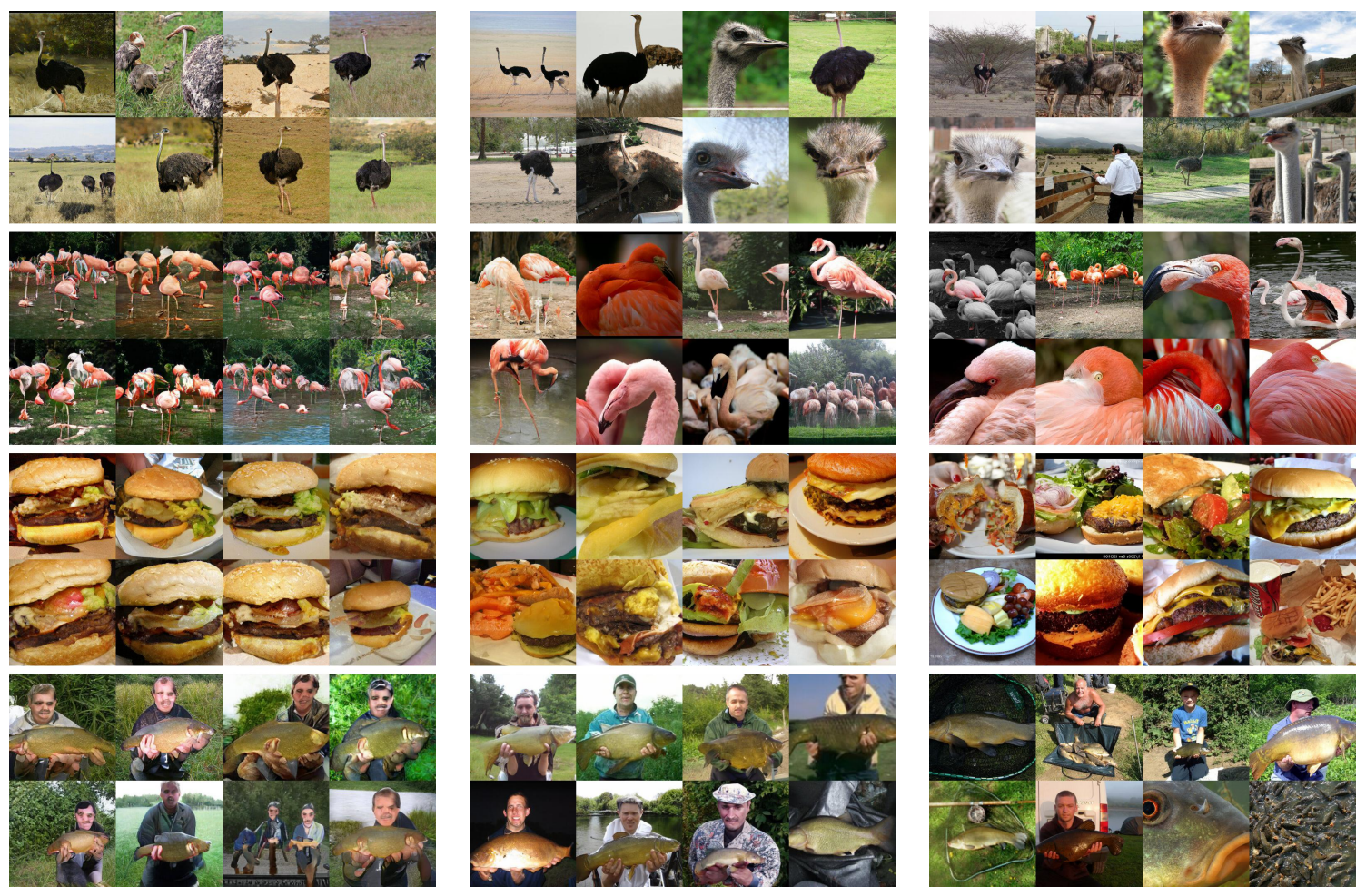 위 사진은 BigGAN-deep과 diffusion model이 생성한 샘플들을 비교한 것이다. 샘플의 시각적 품질은 비슷하지만, diffusion이 GAN보다 더 다양한 샘플을 포함하는 것을 확인할 수 있다.