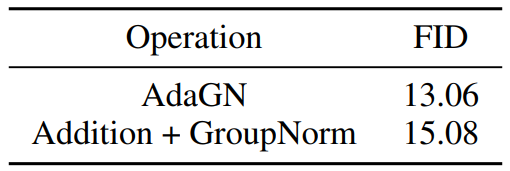 위 표에서 AdaGN이 실제로 FID를 개선하는 것을 볼 수 있다.