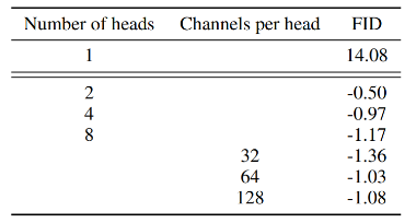 위 표를 통해 head가 많거나, head 당 채널 수가 적은 경우 FID가 향상됨을 알 수 있다. 위 그래프에서 64개 채널이 wall-clock time에 가장 적합하다는 것을 알 수 있으므로 head당 64개 채널을 기본값으로 사용한다.