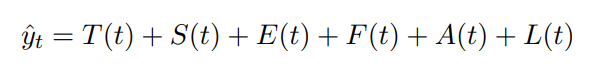 - 각 컴포넌트의 결합을 이용하여 모델을 구성함. 적절한 오프셋 매개변수를 활용하고, 기본적으로는 트렌드 및 계절성 term만 활용하고, 모든 효과를 포함한 식이 위의 식임.